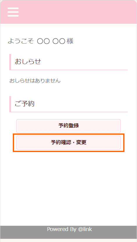 ログイン後「予約確認・変更」を選択します。 [予約の変更]・[予約のキャンセル]はこの画面から行うことができます。