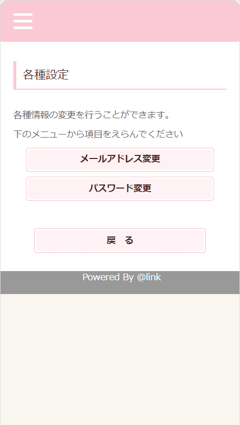 ログイン後「各種設定」を選択します。 [メールアドレス]・[パスワード]の変更はこの画面から行うことができます。