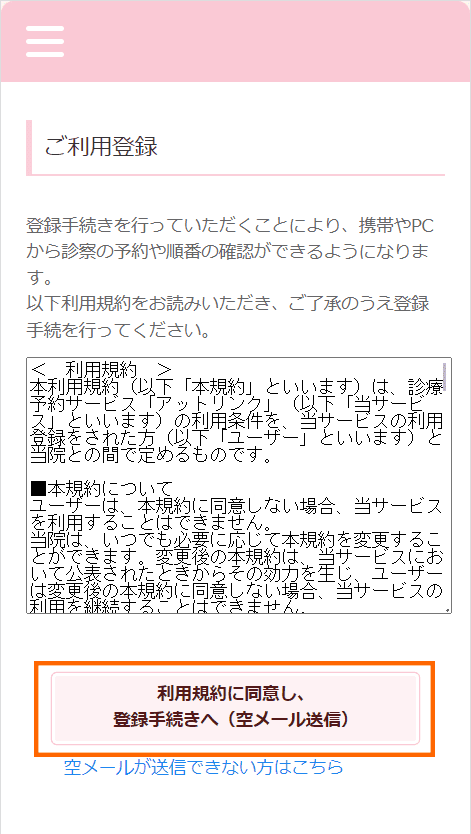 利用規約をご確認いただき、空メールを送信してください。
