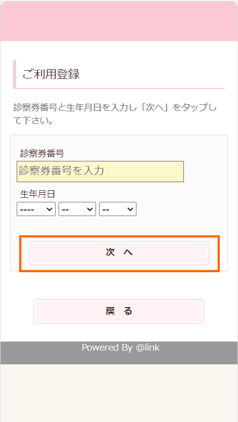 診察券番号と生年月日を入力し、Web予約でご利用頂くパスワードを入力した後に、[登録]を選択してください。